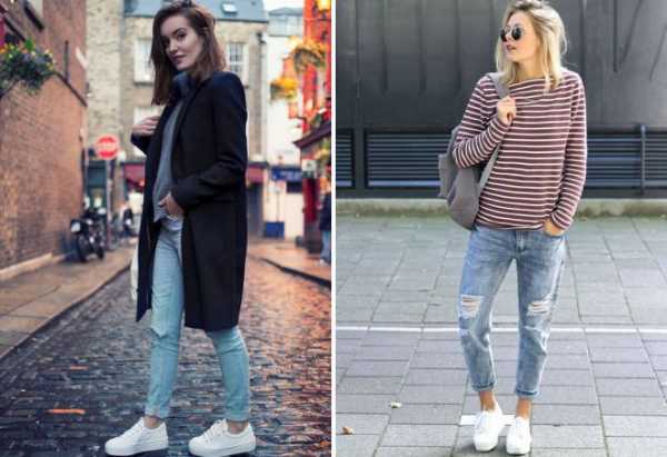 Одним из модных фасонов удобных джинсовых брюк считается узкий облегающий крой. Такой вариант подчеркивает сексуальность в образе и изящность фигуры. Из года в год в тренде остаются светлые расцветки. Однако дизайнеры предлагают модные скинни и с эффектом кислотной стирки, с рваным декором, в черном и темно-синем цвете. Чтобы акцентировать стройные ножки и визуально удлинить рост, не стоит завершать лук яркой или контрастной обувью. Отличным решением будут однотонные темные, белые или черные кроссовки с джинсами-скинни.