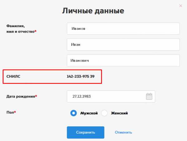 После регистрации войдите в Личный кабинет и в разделе «Личные данные» укажите номер СНИЛС (ваш страховой номер индивидуального лицевого счета в системе обязательного пенсионного страхования).