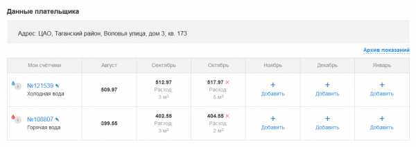 Нажать на ссылку «Добавить» отдельно для холодной и горячей воды, и внести текущие данные по приборам учета за текущий месяц