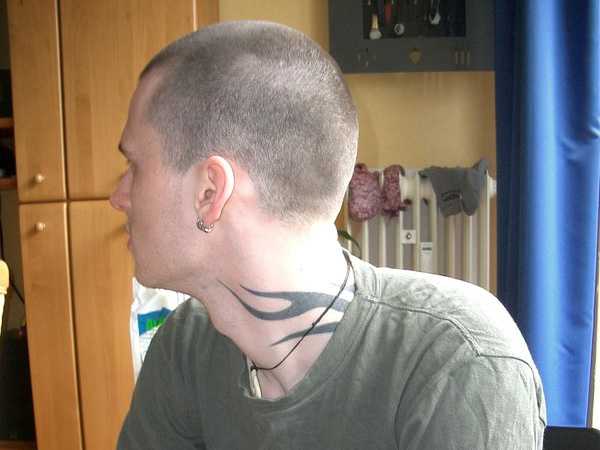 Трендовый вариант для молодых парней. Кстати, именно короткие стрижки будут смотреться лучше, если есть видимые татуировки в области шеи, лица, головы. Так что облысение можно не только слегка скрыть короткой стрижкой, но и сместить акцент на концептуальность личности!