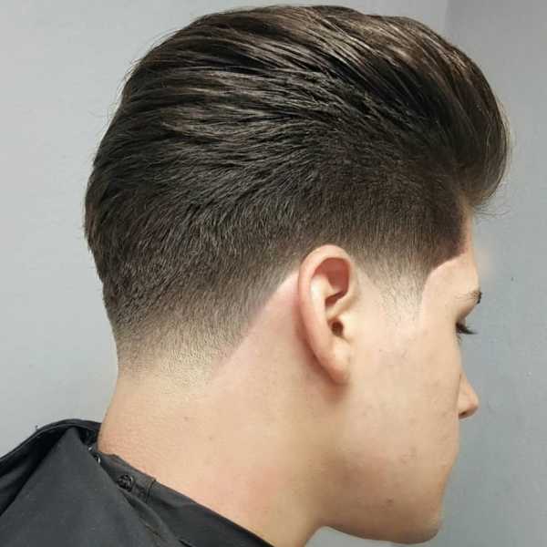 Второй по счету, но не менее популярный способ создать образ с зачесанными назад волосами. Подразделяется среди профессионалов на низкий, средний и высокий тип. При этом допускается создание уникальных элементов, которые придадут фейду качественной оригинальности. Данная мужская стрижка с короткими висками может на первый взгляд напоминать упомянутый выше андеркат, однако имеет одно ключевое отличие — переход между различной длиной волос создается более «мягким» и плавным.