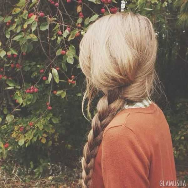 Коса должна идти по диагонали и заканчиваться должна сбоку. Теперь возьмите резинку, завяжите кончик косы и оставьте косу на плече.