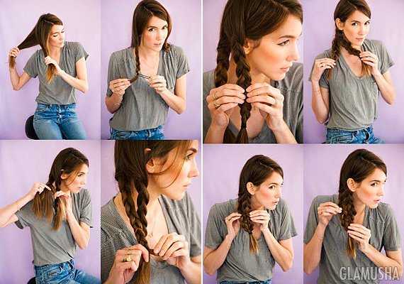 Спортивные прически на средние волосы с плетением косы позволяют выглядеть женственно. Попробуем заплести асимметричную косичку самостоятельно, она позволит не только спокойно заниматься, например, на тренажерах в фитнес-клубе, но и кадрить симпатичных тренеров и мужчин в зале. Следуем пошаговой инструкции: