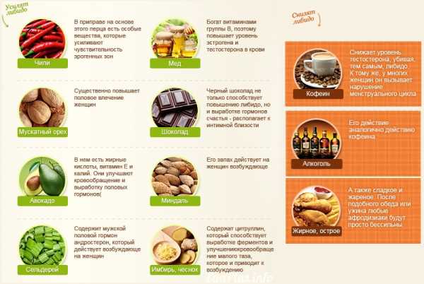 Препараты и возбуждающие средства — это не единственная возможность повысить либидо и улучшить сексуальный контакт с мужчиной. Существует много продуктов, которые помогают расслабиться, повысить уровень эндорфинов в крови и обострить чувства. К ним относятся:
