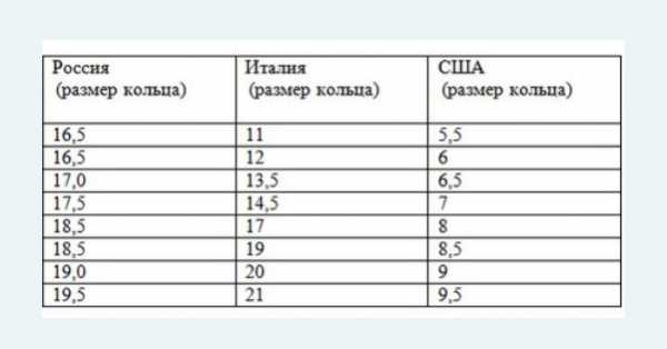 Далее обратимся собственно к размерам. И здесь всё не так просто, как может показаться. В разных странах существуют разные системы размеров колец. Наша (и германская) кажется самой понятной, ведь здесь просто используется диаметр самого кольца в миллиметрах. С ней определенным образом соотносятся, например, итальянская и американская системы (это соотношение приведено в таблицах ниже). А существуют ещё японская,иИндийская, австралийская и другие…